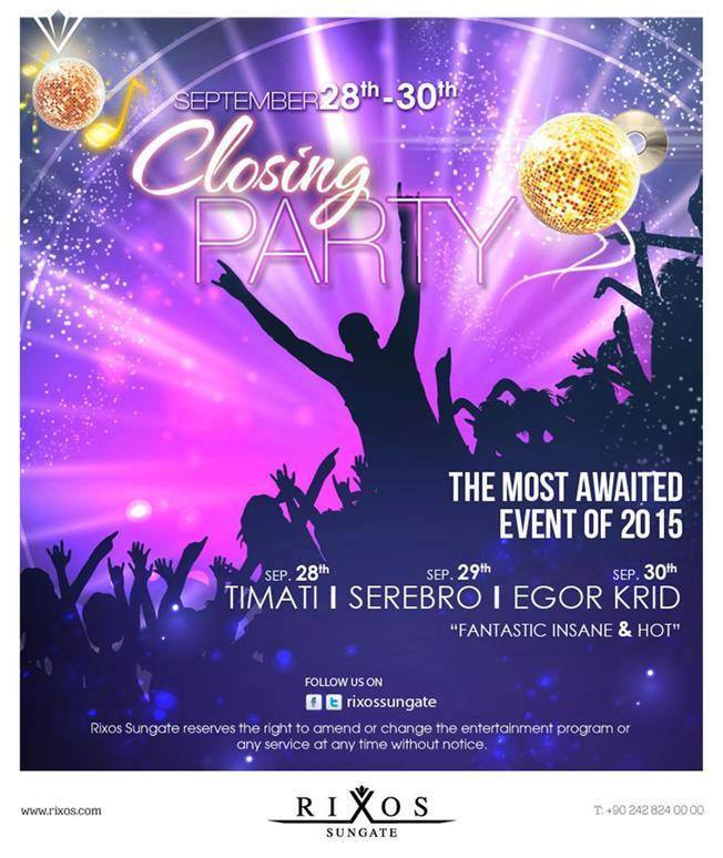 Fii prezent la petrecerea de inchidere a sezonului in hotelul Rixos Sungate alaturi de Timati, fetele de la Serebro si Egor Krid doar la 6155 euro PP.