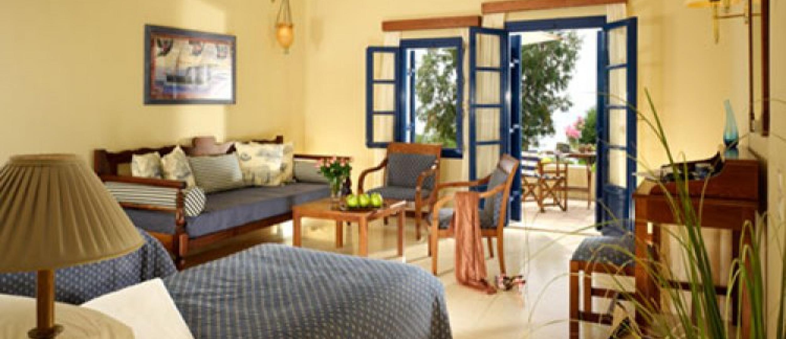 В отеле один главный корпус, выполненный в стиле минойского дворца, и три «критские деревушки» – «Агия Варвара», «Каракас» и «Пиргос», состоящие из одно– и двухэтажных бунгало. Все комнаты, бунгало и сьюты отеля оформлены в традиционном критском стиле, сочетают элегантность декора и высокий уровень комфорта.