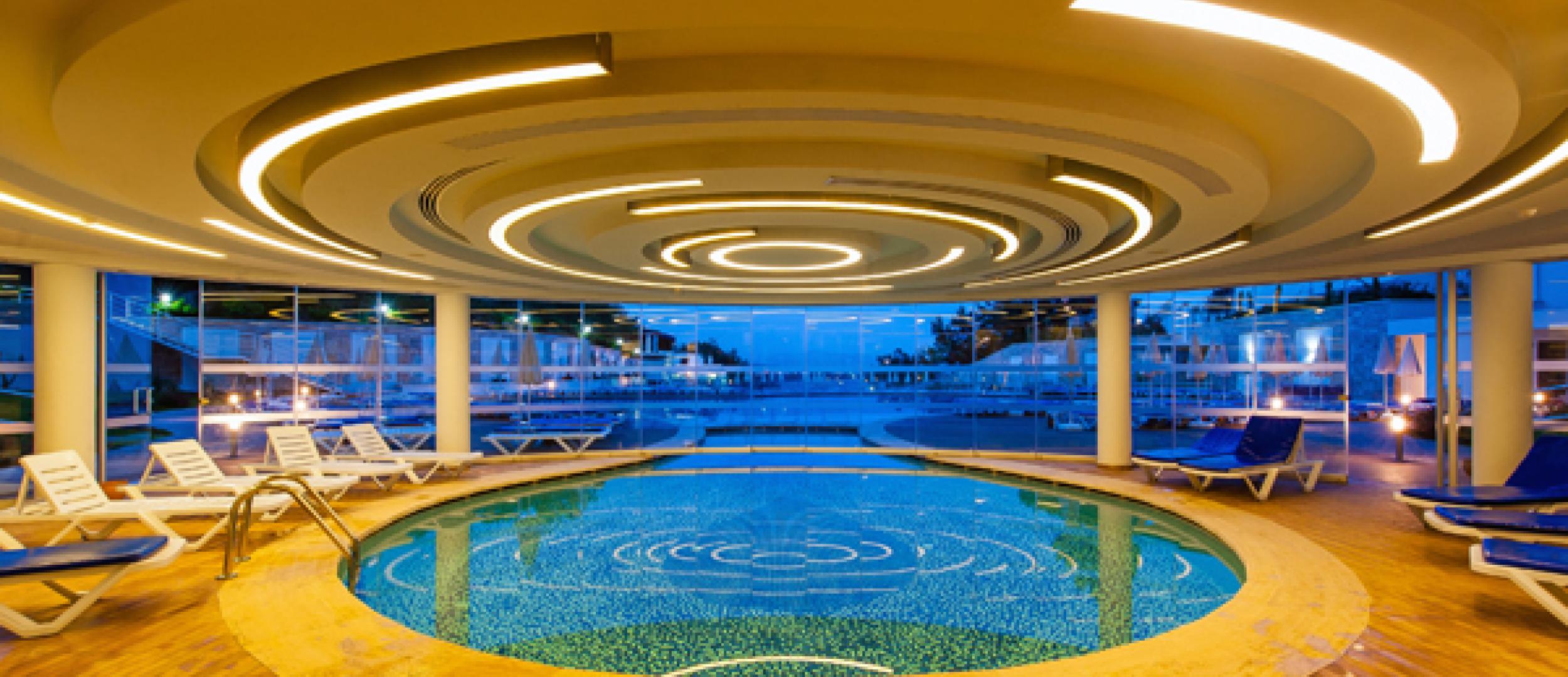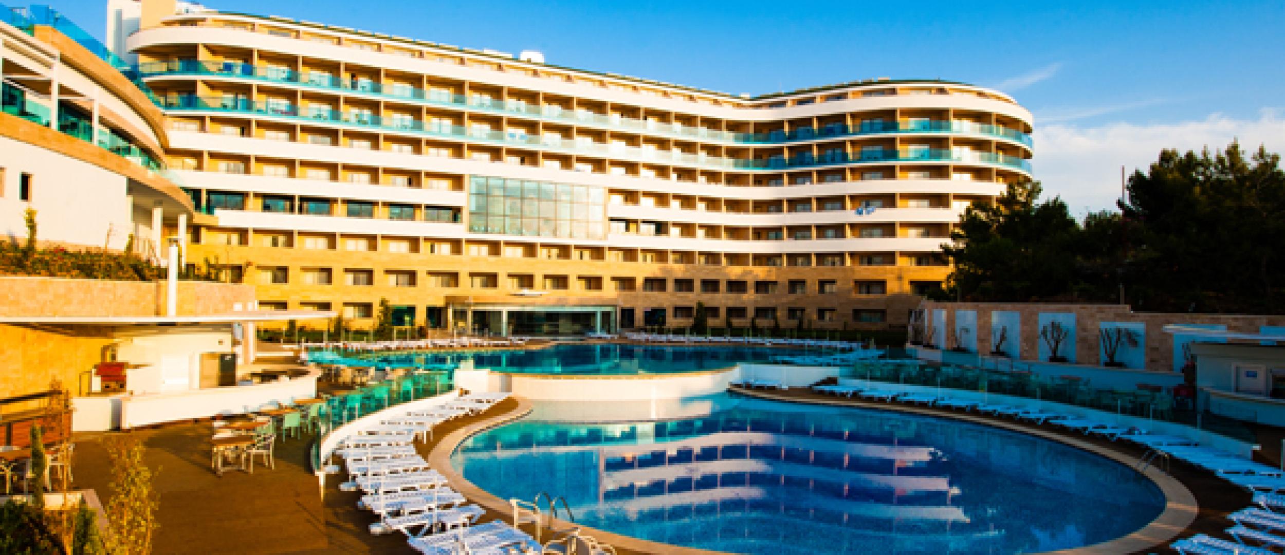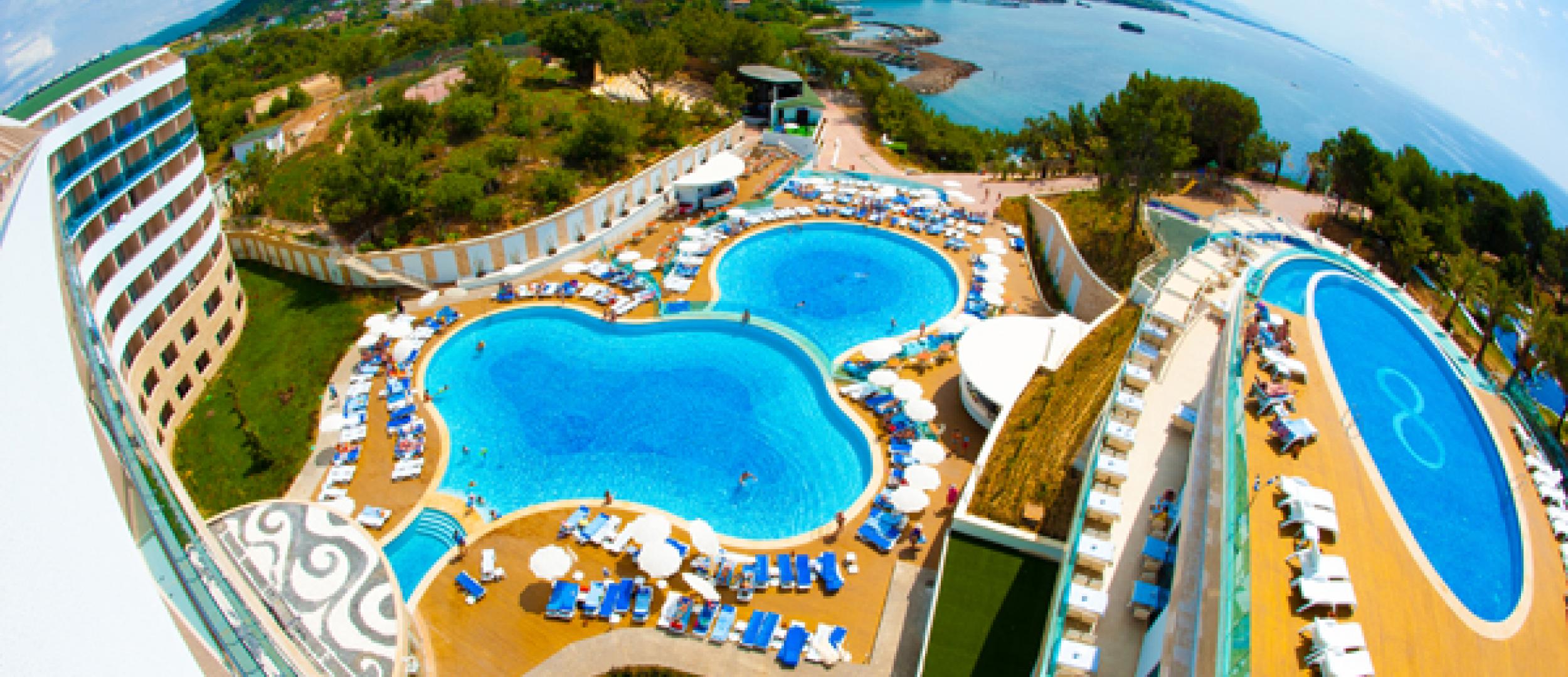 Отель «Water Planet Deluxe» занимает обширную площадь в 62 415 кв. м и представляет собой гостинично-развлекательный комплекс с аквапарком, который расположился прямо на берегу Средиземного моря в окружении пышной зелени естественных лесов. Чтобы каждый нашел здесь себе развлечение по душе, испытал настоящий всплеск эмоций и почувствовал волшебную силу воды, на территории отеля построен самый большой Аквапарк на Средиземноморском побережье. Он представляет собой комплекс водных развлечений, включающий множество аттракционов, горки, бассейны с вышками и рафтинг. Отель подходит для отдыха как семей с детьми, так и для молодежи и работает по системе Ultra All Inclusive